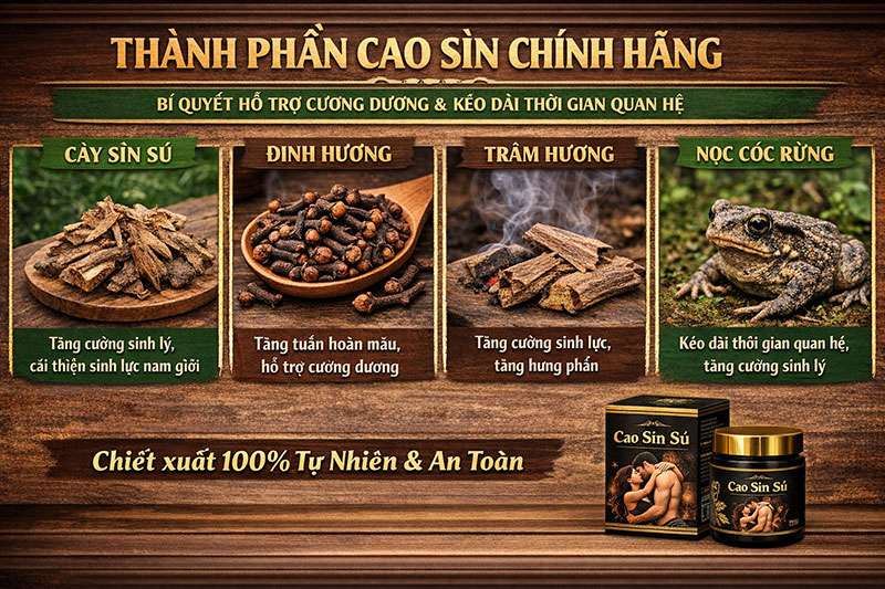 Cao Sìn Sú là sản phẩm được chiết xuất từ nhiều thành phần tự nhiên, bao gồm cây sìn sú, đinh hương, trầm hương và nọc cóc rừng. Dưới đây là một số thông tin về cách các thành phần này hỗ trợ cương dương và kéo dài thời gian quan hệ: